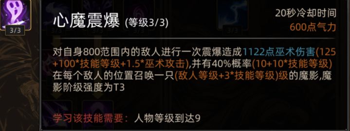 [心魔震爆]这个技能会对自身800码的距离内的敌人造成伤害,有40%的概率在敌人身边召唤一只阶级强度为T3的魔影,在被野怪纠缠的时候释放这个技能,有概率召唤出魔影。