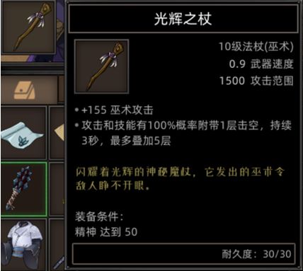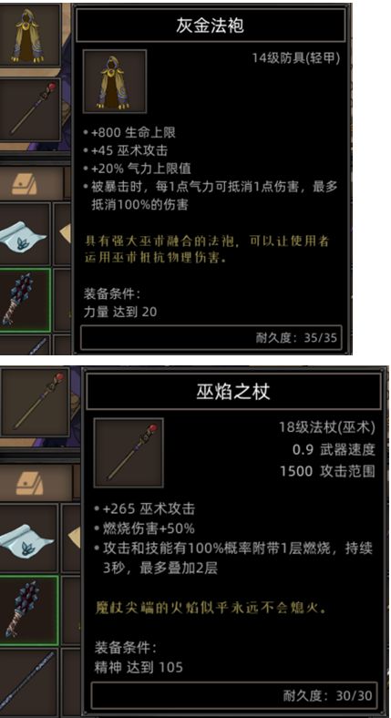 到游戏后期后,需要强力装备了,巫焰之杖和灰金法袍,是绝佳的选择,这两件装备都有特殊效果,灰烬法袍是在被暴击时会每一点气力就会抵消一点伤害,甚至可以抵消百分之百的伤害,巫焰之杖则是普通攻击和技能时有百分之百的附带一层燃烧,只会叠加两层持续三秒。