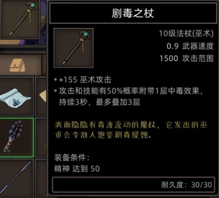 剧毒之杖,这把武器在雾林村的右上角树宫副本难度十六级,特殊效果在普通攻击和技能都有百分之五十概率附带一层中毒效果持续三秒可叠三层,也是不错的选择。