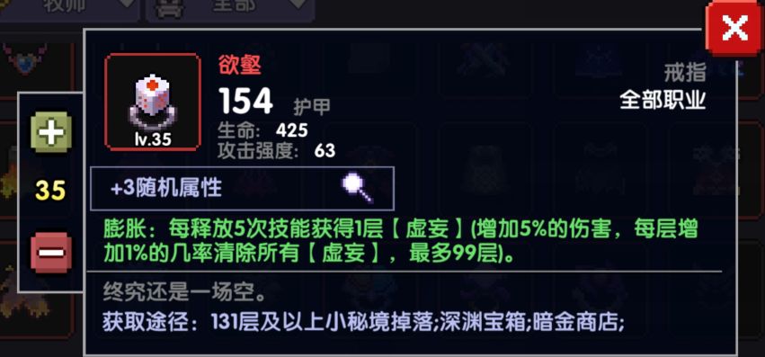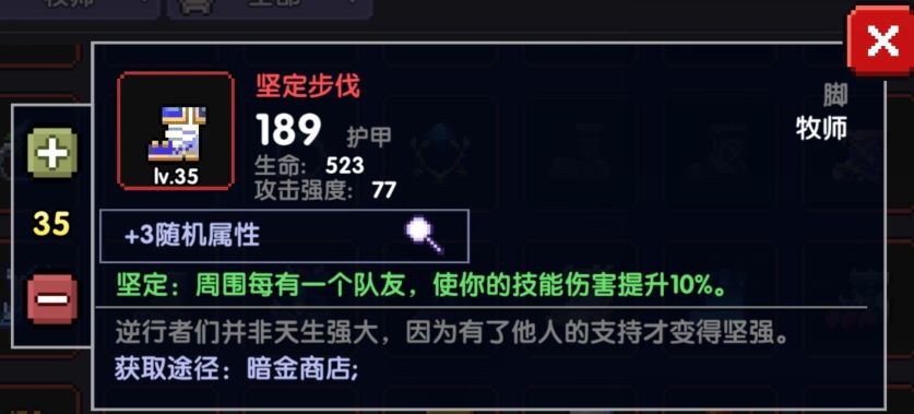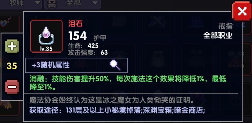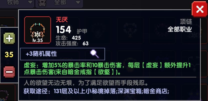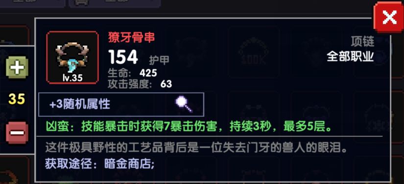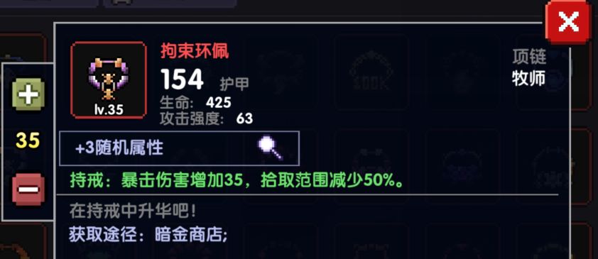 这个项链和拘束属性是一样的,都是+35爆伤,但唯一不同的是,拘束会减少拾取范围,所以新项链容易拾取生命球和能量球,保证血量和蓝量,或者是在竞技场拾取星星都有很好的表现,所以没有拘束项链或者资源有多的情况下可选择新项链。如果暴击不够还是老实的选择无厌吧。