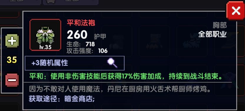 6.平和法袍:使用非伤害技能后获得17全伤,持续到战斗结束