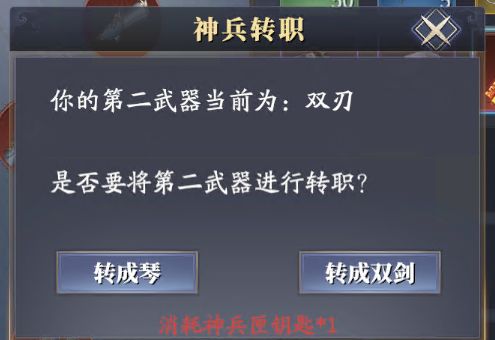 神兵匣钥匙可以通过商城购买(800元宝)或者活动获得(之前名剑宝阁送过神兵匣钥匙),获得神兵匣钥匙后,在背包中点击使用,需要注意的是,转职前要做好以下准备工作:①身处大世界安全区(副本中禁止使用道具)②已经开启第二武器(若没开启则会变成开启第二武器)③身上没有第二武器的开启任务