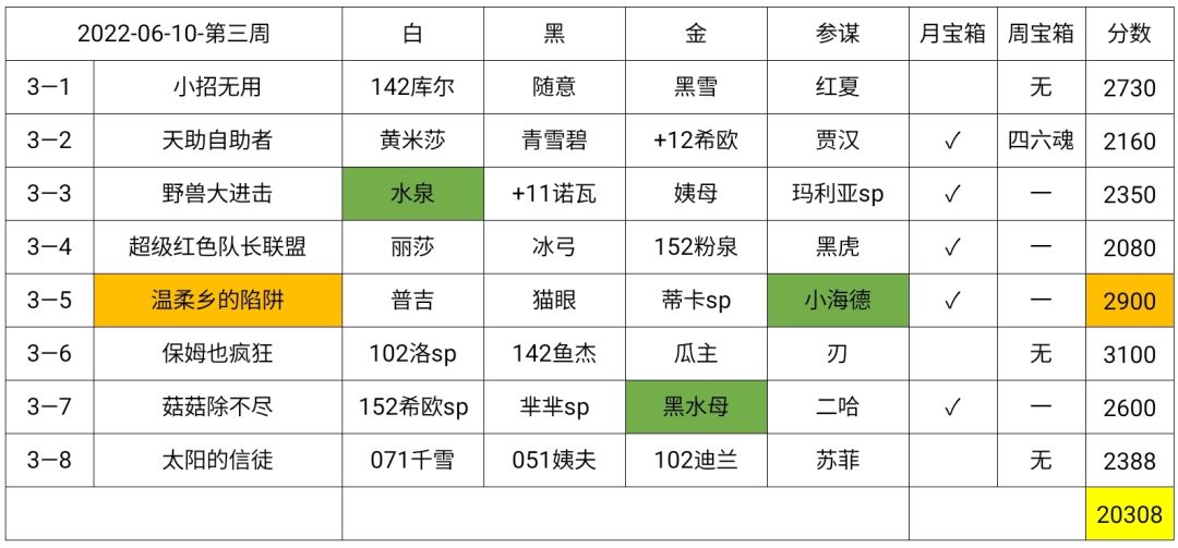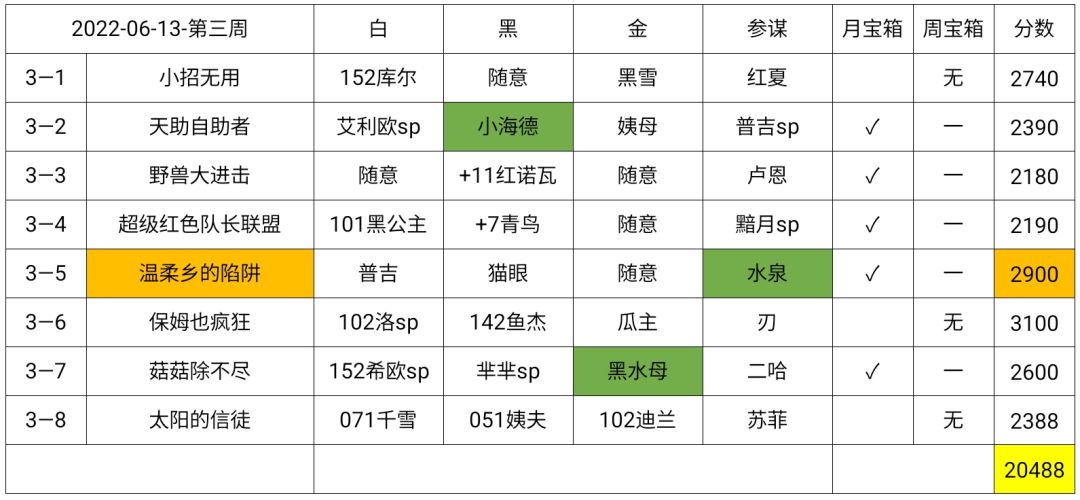 思路:开局指芈芈,后续指金,魂盘全金,全程金6(尽量带负面),因为有月宝箱,先用左侧的魂芯不容易断6魂,参谋用增伤的,我用的二哈,理论用雷萨杰罗姆之类的系数参谋收益也很大。