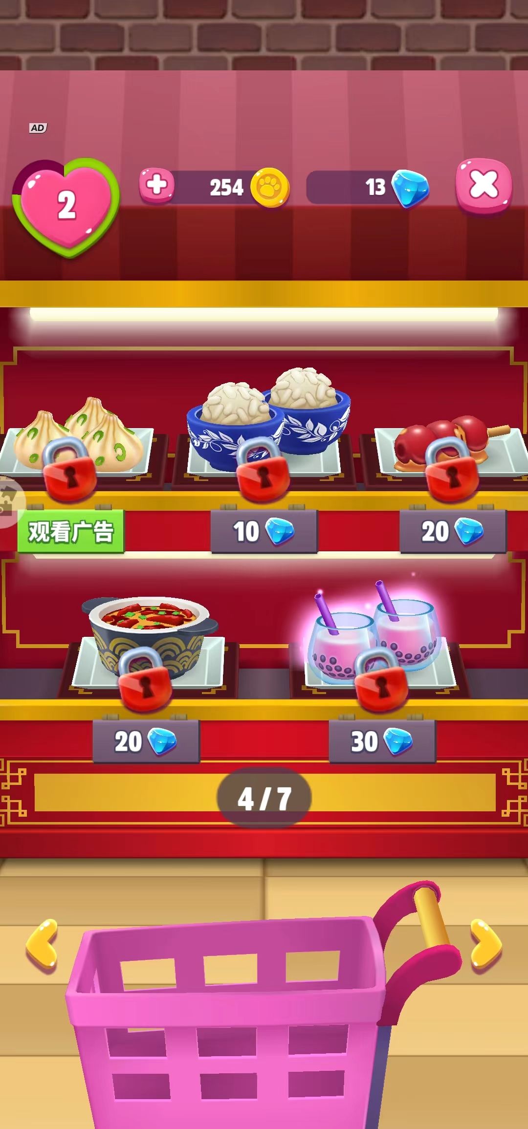 我们进行翻页操作,可以发现除了金币购买的食材外,还有使用钻石购买的美食。用钻石我们可以买到灌汤包子,珍珠奶茶,糖葫芦等非常多美味的食物。