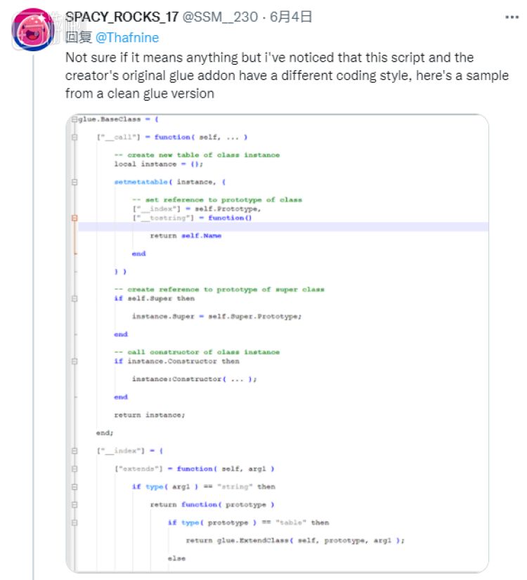 另一种说法指出,可能有人盗用了这位作者的账号,替换了原本的文件。一位玩家找到了旧版本GlueLibrary的源代码,代码风格比脏话连篇的假MOD要清爽得多。