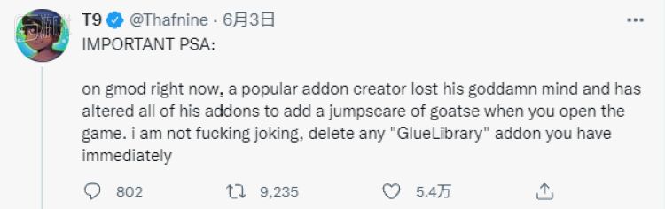 Youtube视频作者T9(Thafnine)在推特上写道:“一位受欢迎的插件创建者发了疯,篡改了他所有的插件,以便在你打开游戏时被吓到。我不是在开玩笑,立刻删除你所有与GlueLibrary相关的插件。”