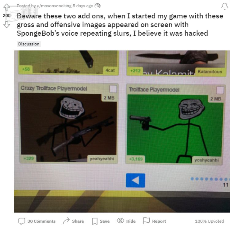 其中一系列MOD“Troffface Playermodel”会弹出带有冒犯性的图片,以及用软件模拟出的海绵宝宝的声音,一刻不停地发表着种族歧视言论(它们很快连带着作者一起遭到了封禁)。