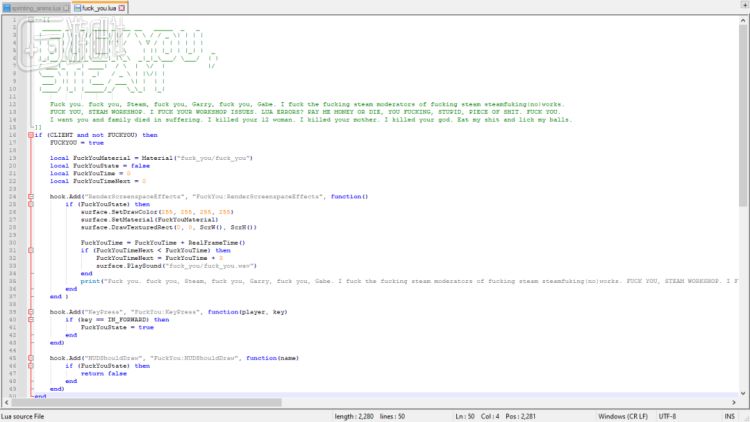 为了证明MOD作者的确发了疯,T9放出了MOD文件源代码的截图。代码中充斥着连篇的脏话,输出对象包括Steam、创意工坊、平台管理员、《盖瑞模组》的制作者盖瑞本人,以及V社老板Gabe