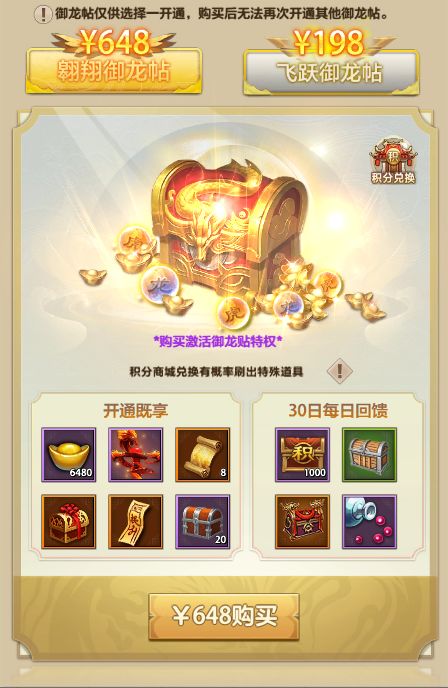 活动期间,玩家可在精彩活动页面进行御龙帖的购买以及每日奖励领取,有两种档位的御龙帖可以购买,只能选择一种购买,御龙万宝礼盒按照玩家当前等级获取不同奖励。与往期御龙帖不同的是,本次活动礼包是升级版!其中特别新增了积分商城刷新道具!免去了少侠苦等商城随机刷新之痛、可以更快速的换取少侠所需的积分商城道具哦~