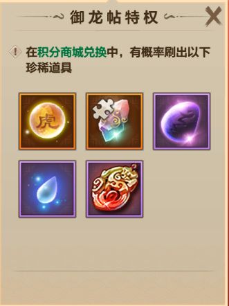 除上述奖励之外,开通御龙帖还可享受御龙帖特权,在积分商城兑换中,有概率获得妖虎元神、九天灵珀碎片、润魂石、翡翠心精、铸纹血玉等珍稀道具!开到就是赚到!