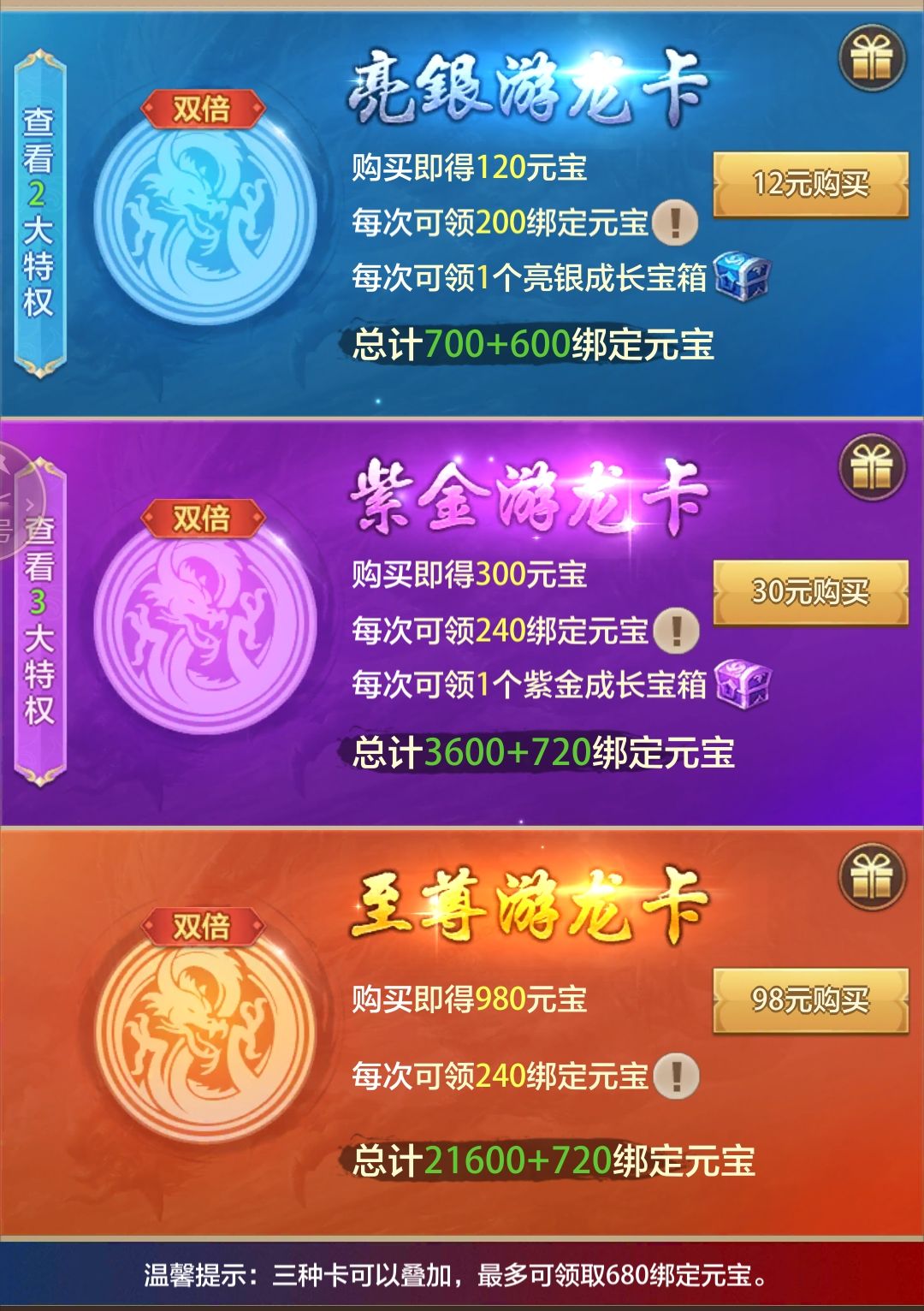 活动期间,四种游龙卡每日领取绑元翻倍,活动期间显示的绑元数为翻倍后的数量。周年游龙卡仅有购买过的玩家可以领取,本次活动不开放周年卡购买。