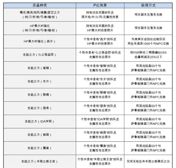 部分灵晶在潜解后,可以原先仅作用于装备者的效果作用于全队,这就是P(Party)化队伍中的队员装备P化灵晶的前提下,该灵晶效果对于队中所有符合要求的队员均生效也就相当于让队员在原有的3/4个灵晶位的前提下,通过P化共享获得了队友提供的第4/5/6/7甚至更多的灵晶位,进一步提高攻击