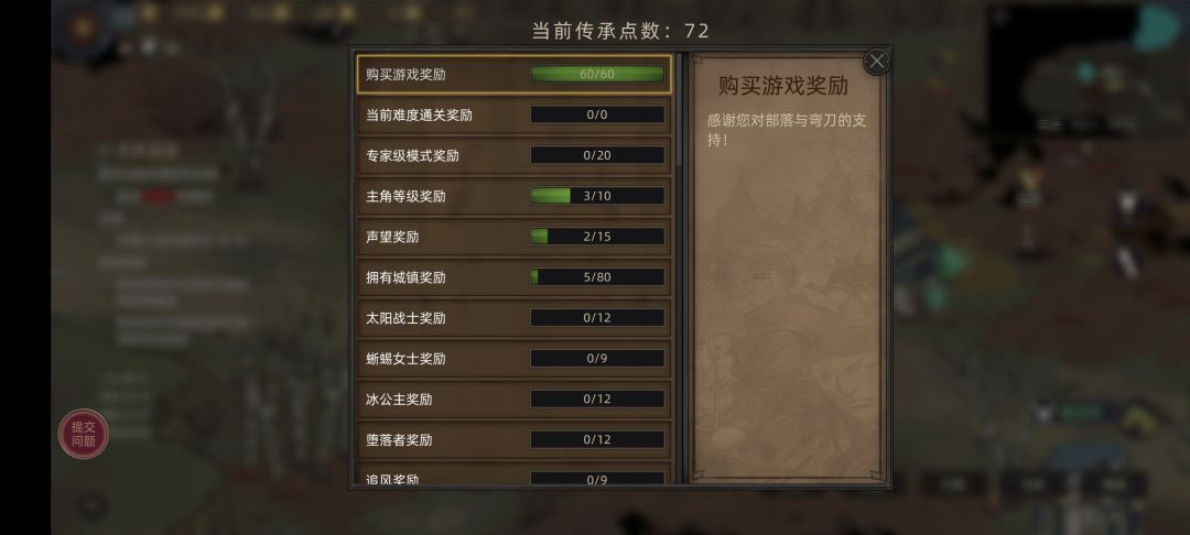 最开始要介绍的是传承点数,虽然看似和周目没啥关系,但是这玩意是开局物资所换取必备物品,买完游戏会送60传承点,然后完成各种成就获得额外的传承点数量(永久加),正常最高可以累计400点,专家难度还会给20点,周目难度每层给20点