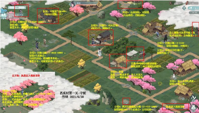 ༺千年出品༒只出精品༻[帅]只说重点更好记👍1-1守候:4支线 1山洞图1、下方桃花林深处守剑人(15级9135血)选项一需要高级些了才打得过;选项二他需要的是1-7里得到的“不起眼的石头”1-2行侠:4支线 1宝箱图2、妇人任务得到“绣花针”后第一时间去右边打开宝箱后再还;流浪汉对话(须要1级轻功)选项一要的酒在关卡1-4里;选项二打败他(9级3780血)“两种都选一次才能完美”1-3寄信:3支线 1山洞“公鸡🐓”在右上方山洞里;1-4甘甜:2支线 1山洞酒坊旁的村民得到“酒”是1-2流浪汉需要的;1-5草帽:3支线左侧树林深处神秘人(15级9135血)选项一打败他得白棋子*1;选项二须要1-7里的“不起眼的石头”1-6催促:2支线(土匪和村民)1山洞1-7等待:3支线 1山洞 1宝箱图3、下方荷花池里有宝箱,需要“3级轻功”1-8算帐:2支线(地痞和老道)1-9念想:3支线 1锁月楼图4、土匪要的书在1-6里,两个选项都要点才能完美1-10归来:2支线 1宝箱(须5级轻功)求赞🍑求评论✍️求关注👀谢谢捧场~[跳舞]