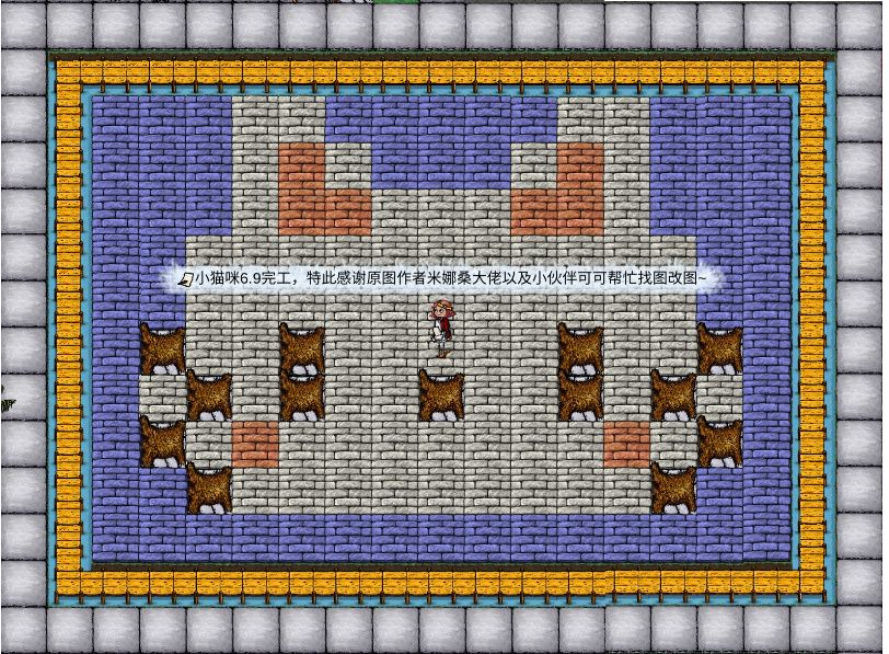 然后特别感谢可可,这块地在之前就肝好了砖地水渠,还染了最外层蓝砖,里面的图案没想好肝啥。可可帮我找了好多图,设计了好多个不用去很多外层蓝砖颜色的方案哈哈哈哈。其他方案也超棒,纠结好久, 最后问了室友才确定肝这只小猫咪~