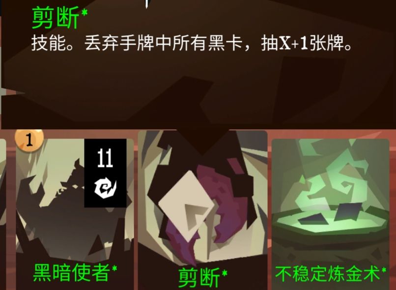 不稳定炼金术:两张卡合成其中一张的同种卡(概率各为50%,卡牌种类比如状态卡,近战卡,远程卡,技能卡,护盾卡,黑卡等等),本回合加攻击力并获得副产品(抽卡+回弹),没什么好说的,同样拿多段卡,因其独特的机制战利品可以很随意