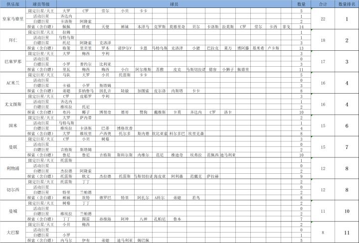 简单的针对主流俱乐部的卡片强度、数量做了个统计。