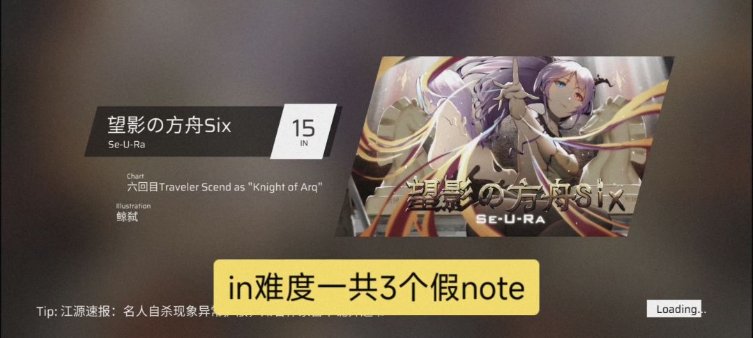 3. 然后游玩和重生同档难度的 “望影の方舟Six”(此时方舟的铺面才会增加假note,即下落速度较慢 和铺面格格不入的note),不要击打假note(EZ难度下只有1个(如下图所示),HD难度有2个,IN难度有3个(如下方附的视频所示)),并且达到A及以上,退出结算页面时会跳转 Igallta 的解锁动画。