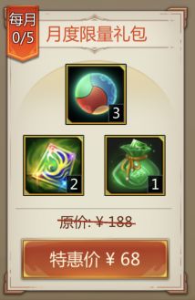 并且充值68元同样可以完成版本首充任务,获得月光宝盒十连抽。并且月度限量礼包限购5个,通过重复购买也能够达成前面几档的珍宝,同样可以获得丰厚的珍宝奖励。