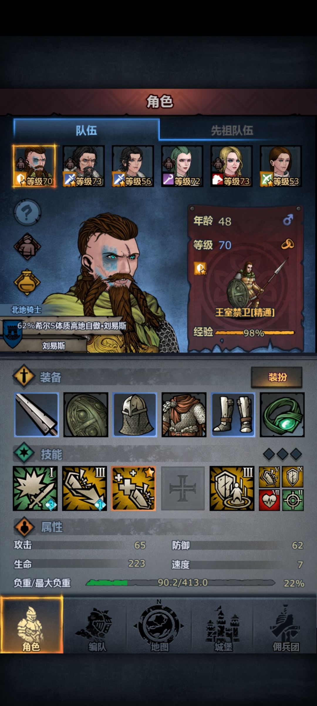 4、650年到700年这50年最难过,因为为了攒王血而在佣兵团招募了太多人,导致每年消耗高达800、900的(后来才知道城堡升级也会提升消耗),消耗太快根本没有太多可转化物资。而且前期除了基斯是37%在酒馆招募到这么高王血属实不多见,12%、25%、披着王血发型的平民比较多。我之前评论过我从法拉的翠庭酒馆招募到75佩尔王血的是真事,但是那是上一次存档了,这次还没有招募到很好但离谱的角色。所以为了保证团队能正常运转,踢人是必要的。一般王血提纯的同时能力值也会慢慢上涨,所以可以根据团内战斗力、高血脉成员等综合考虑来确定删除血脉稀薄、能力值低、没有生出更高血脉的成员。50血脉的最好多留一留,37%的如果特性好也留着,剩下的看着处理。