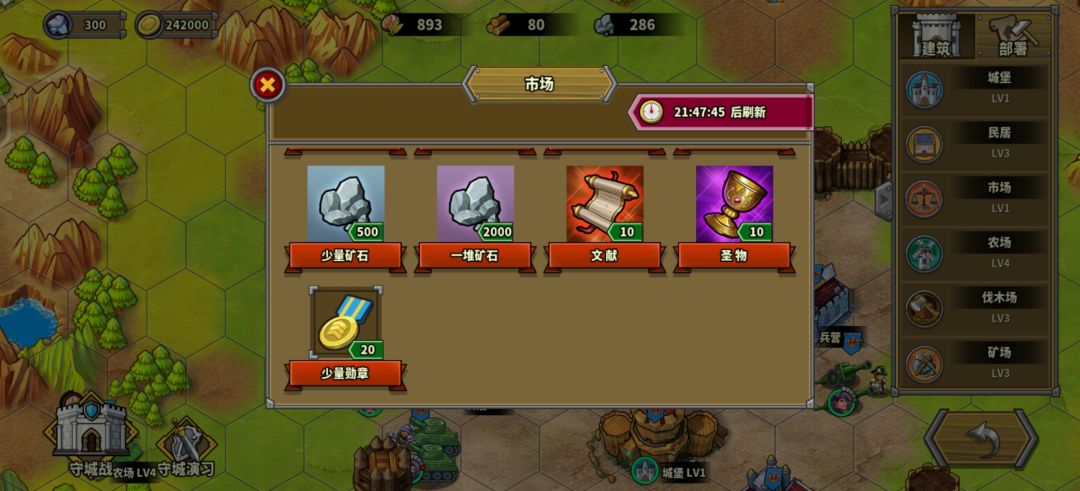 再然后我看到市场等级为1级,我想想也许市场升级能增加勋章的获取,结果找了一圈没发现升级市场的地方!!这也许意味着真的是3天20勋章了,又或许会随着城堡时代的升级而升级?这个不确定,总之先给个差评再说!
