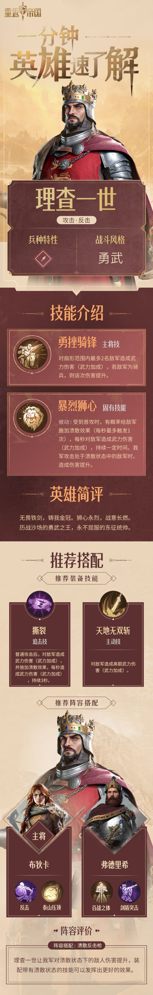 理查一世利用溃散状态提升我军对敌伤害,弗德里希的回复技提升队伍续航,此阵容能加速敌方溃败,帝国人称“