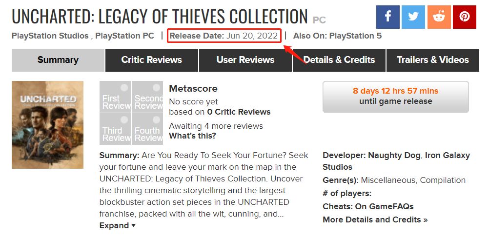 Metacritic显示《神秘海域:盗贼传奇合辑》PC版 6月20日发售