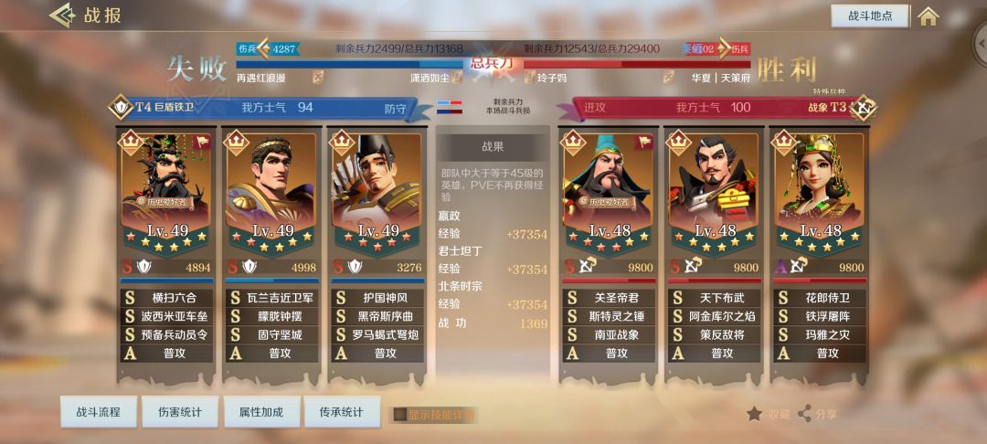 在这个队伍中,如果携带猛虎为了禁疗,输出就不稳定,因为嬴政只有2/5回合施加恐惧,伤害不稳定。同时,这个赛季除了织田长弓手队,基本不会有弓兵队,克制关系基本不存在,而常规关羽,集火爆头队,均为骑兵。尤其是爆头队的马穆鲁克。而反击队携带盾兵,比上述的队伍更恶心。好的我们进入战报分析。