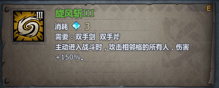 精通之后的技能,我个人觉得旋风斩是挺不错的,主要是个主动技能,还有伤害加成,虽然说消耗你的AP,但是你只要带上军团技能,基本上也是不缺招架反击的AP。
