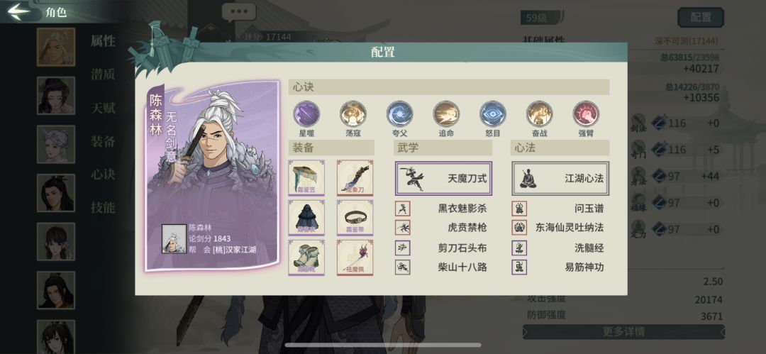 由于昨天的更新使得可以每天多刷海市蜃楼也是把自己等级拉到了59级,然后去把之前卡关的最后一章剧情过了。卡剧情的可以过来参考,也麻烦老鸟看看心诀和武学上有没有可改进的。