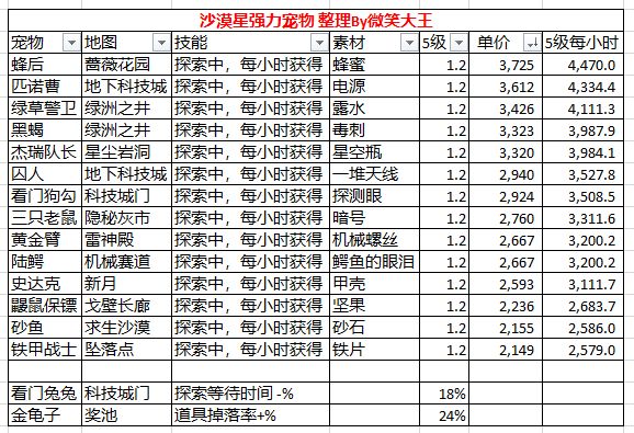 沙漠星的宠物我也整理了一下,比较有用的就是下面的素材宠和掉率减时间的啦