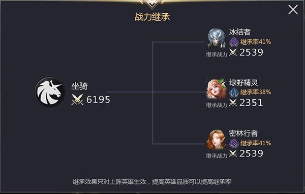 玩家可以通过使用坐骑进阶石对坐骑进行升级,升级后使用祝福缰绳升阶后就可以解锁全新的坐骑外观,并且得到大量的属性加成,不同的坐骑对于不同的出战英雄会有不同的战力继承,英雄的品质越高,继承率也就越高。