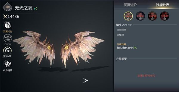 羽翼一共拥有精准之力(命中)、强袭之力(攻击)、自然之力(暴击)以及神盾之力(伤害加深)4种技能,为玩家提供百分比的属性加成,通过提升羽翼的等阶后可以学习。
