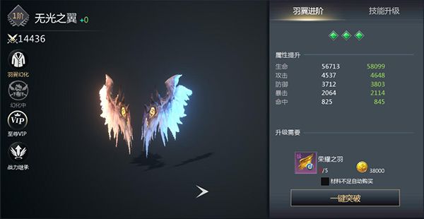 玩家可以通过使用羽翼进阶石对羽翼进行升级,升级后使用祝福缰绳升阶后就可以解锁全新的羽翼外观,并且得到大量的属性加成,不同的羽翼对于不同的出战英雄会有不同的战力继承,英雄的品质越高,继承率也就越高。