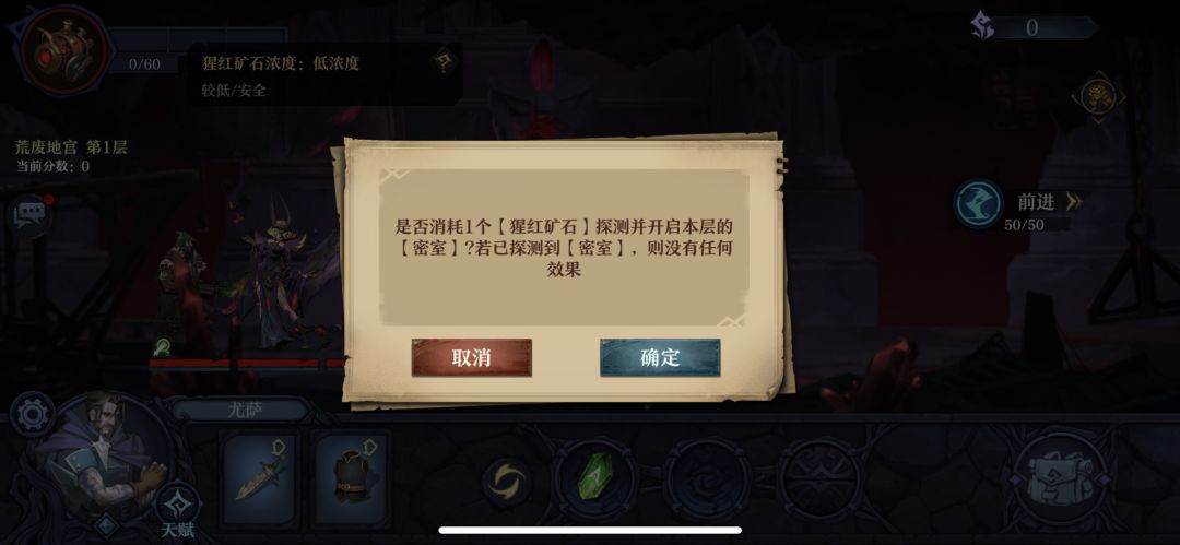 (2)猩红值最好低于60,这里涉及到关卡机制猩红探测器,一但溢出,各种战斗负面,偶遇怪物的几率会大大提升。解决办法是将猩红石头用来当探测器燃料。(左上角)它能帮你找到密道,或者拿来和侏儒交易,开启密道。每一个猩红石减5浓度。猩红石头是可以直接使用的,恢复全队百分之的生命以及十点精神,但是会永久增加5猩红值。每场战斗结束,也会增长5猩红值,实际上当猩红开始溢出之后基本很难处理了,不要贪图装备猩红词缀的强大。确实有必要的,请最好控制浓度在60以下即可。