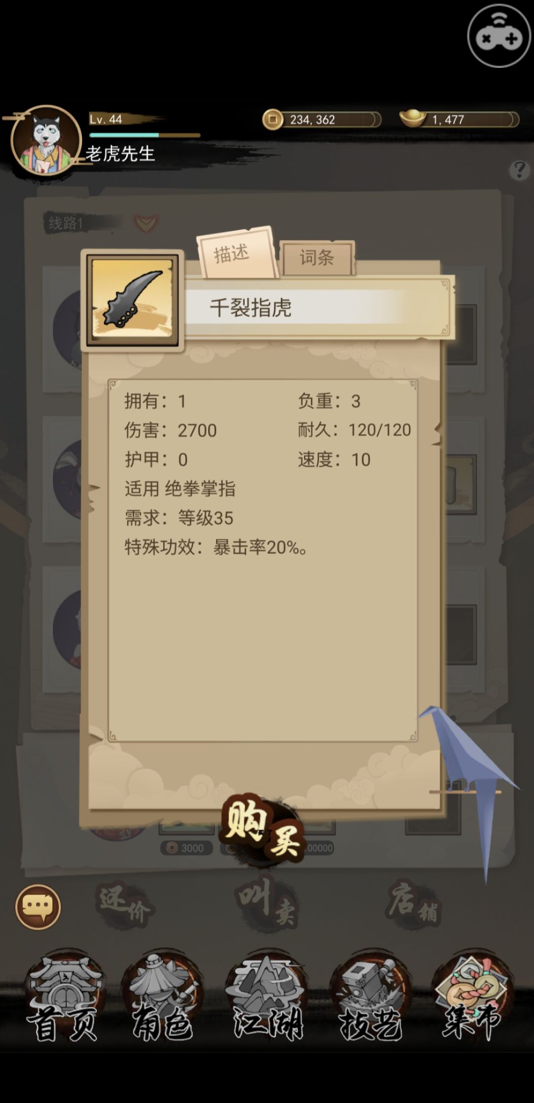 例如山贼副本产出的千裂指虎,特效是增加20%暴击率。