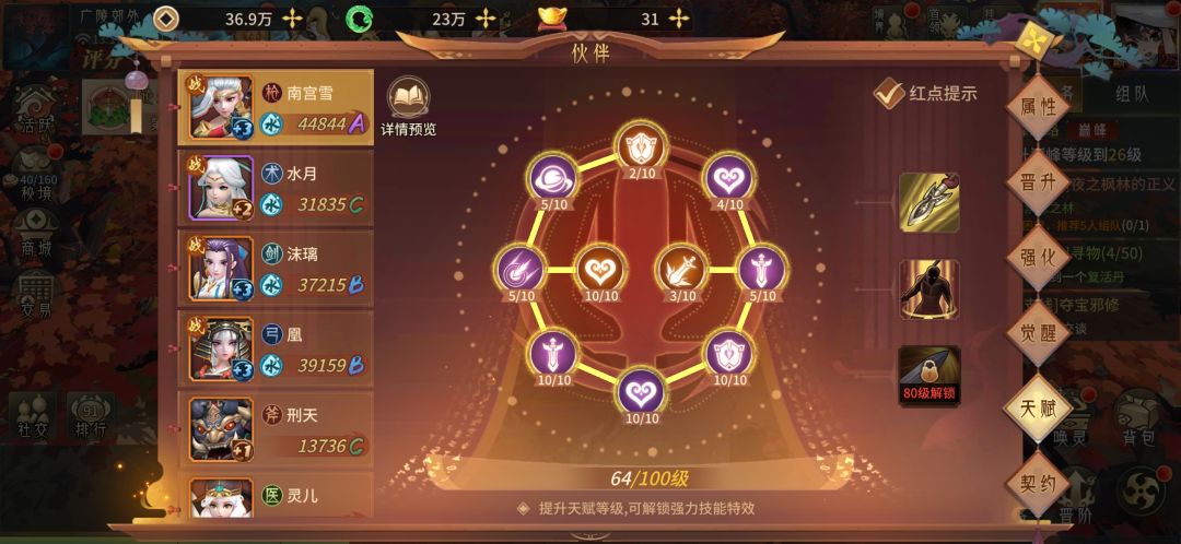 伙伴,这个东西也是要慢慢来,是最花精力的一个了,需要强化,天赋,声望,契约,晋升碎片,觉醒。是最耗时间的一个。我玩了两个月只能白嫖这么一点点 这里建议一下白嫖就不要用传说伙伴了,虽然厉害,但是没办法白嫖强化。指的是取舍格乐。格乐很好用就是对白嫖不友好。推荐阵容(格乐,姜子牙,鹿尧,大司命)(白嫖还是尽量用稀有伙伴吧)(子牙,鹿,医仙儿,烛照)当然看你自己,白嫖谁也打不过 ,所以我是看自己心情来随便用的,毕竟只要培养高了也不会差。