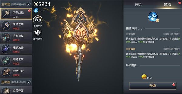 每种主神器都有自己的神器技能,能对敌人造成大量的伤害,玩家最多可以同时上阵一个主神器,通过自有的切换改变神器技能。神器技能可以通过使用神器魂晶进行提升。