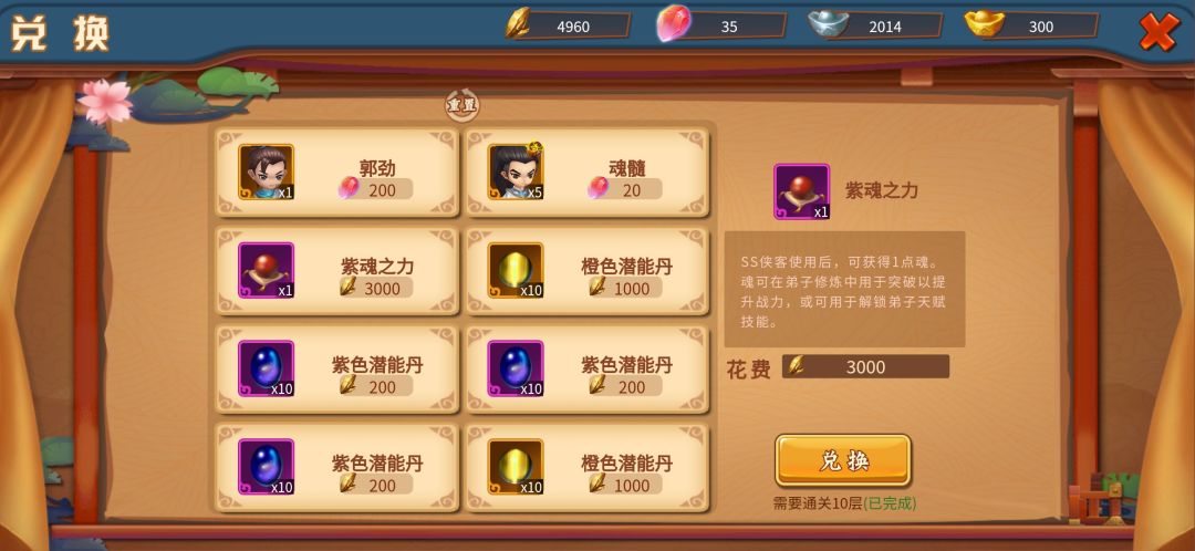 试练塔通过,领完奖励,继续培养,兑换试练塔商店材料很幸运碰到了掌门主魂,紫魂之力!买了