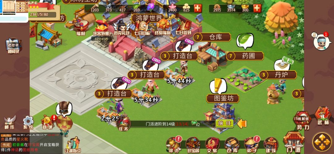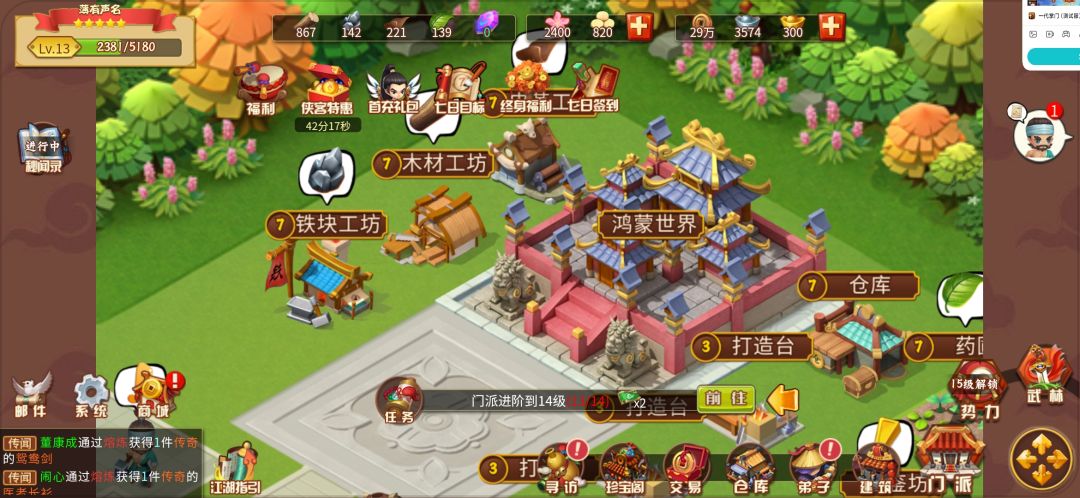 第一天将门派升到13级,建筑升满。达到薄有名声!