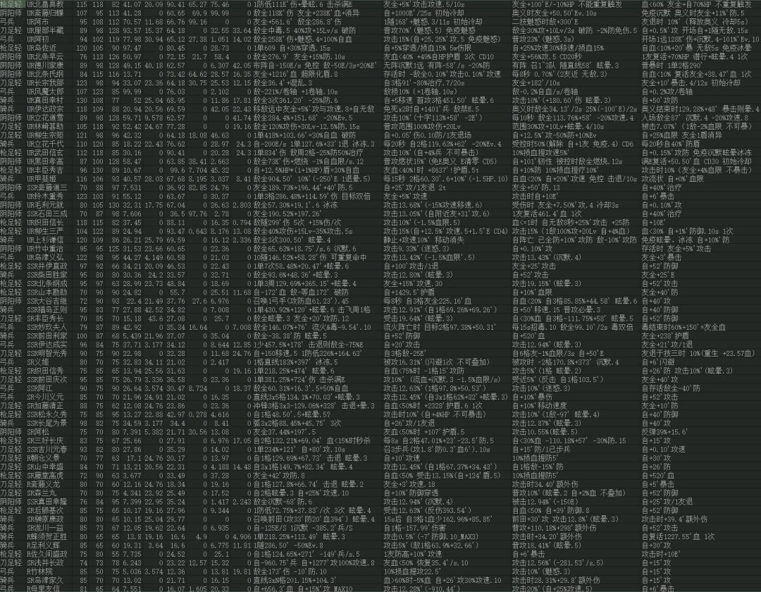 从这些技能中,可以看到有一个破盾,这个也很有意思,制约盾流是吧。还有一个是BUFF的无限叠加,以及低血限斩杀,也很强力。最顶的还是那个奶,强度直接是服部、归蝶她们的一倍,各种友全各种敌全,BUFF全满还带全体复活,啊,这就是圣魂武将的实力吗,恐怖如斯。然而这么顶的奶,竟然是个弓?不过想想也合理吧,前面也分析过了,往后都是兼顾奶和输出双重能力的走向了,阿市就是最好的实证,攻奶兼备。