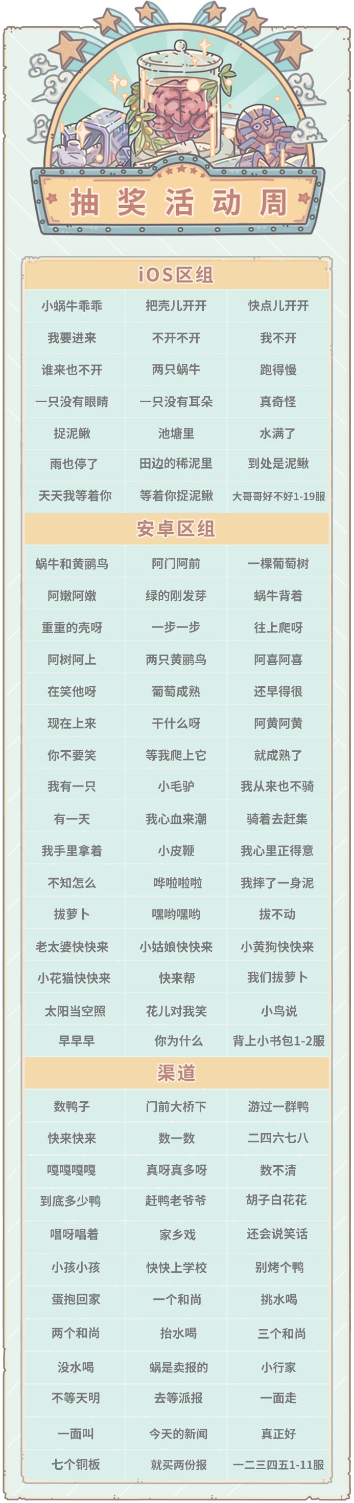 本周五6月17日凌晨五点,部分服务器活动将更新为抽奖嘉年华,以下是进入周活动的区组: