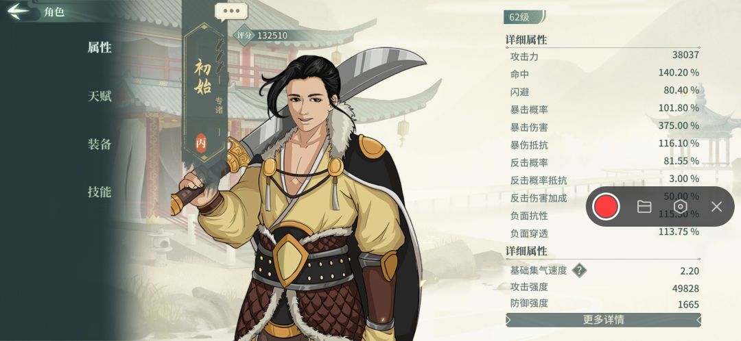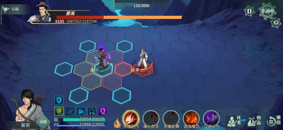 第三关,豫让,本来应该可以自动过的,但是我的技能顺序忘记调整了,导致会使用江湖心法原地罚站一回合,所以就手打了……buff选择攻击力,切金断玉看似很美,但是下一关专诸是个脆皮,防御力只有不到2000,破甲收益不如攻击力。