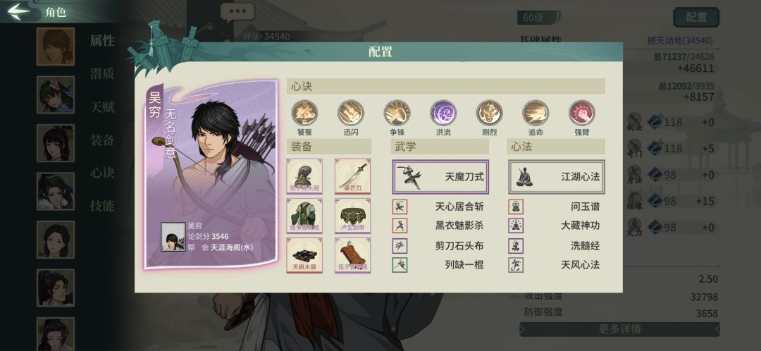 先看配置,伍子胥套装+卢生剑带+初始日本鞋+初始鎏芒刀,心决器值总共用了33,用饕餮不用星噬是因为星噬不加攻击力,饕餮加10%攻击力。