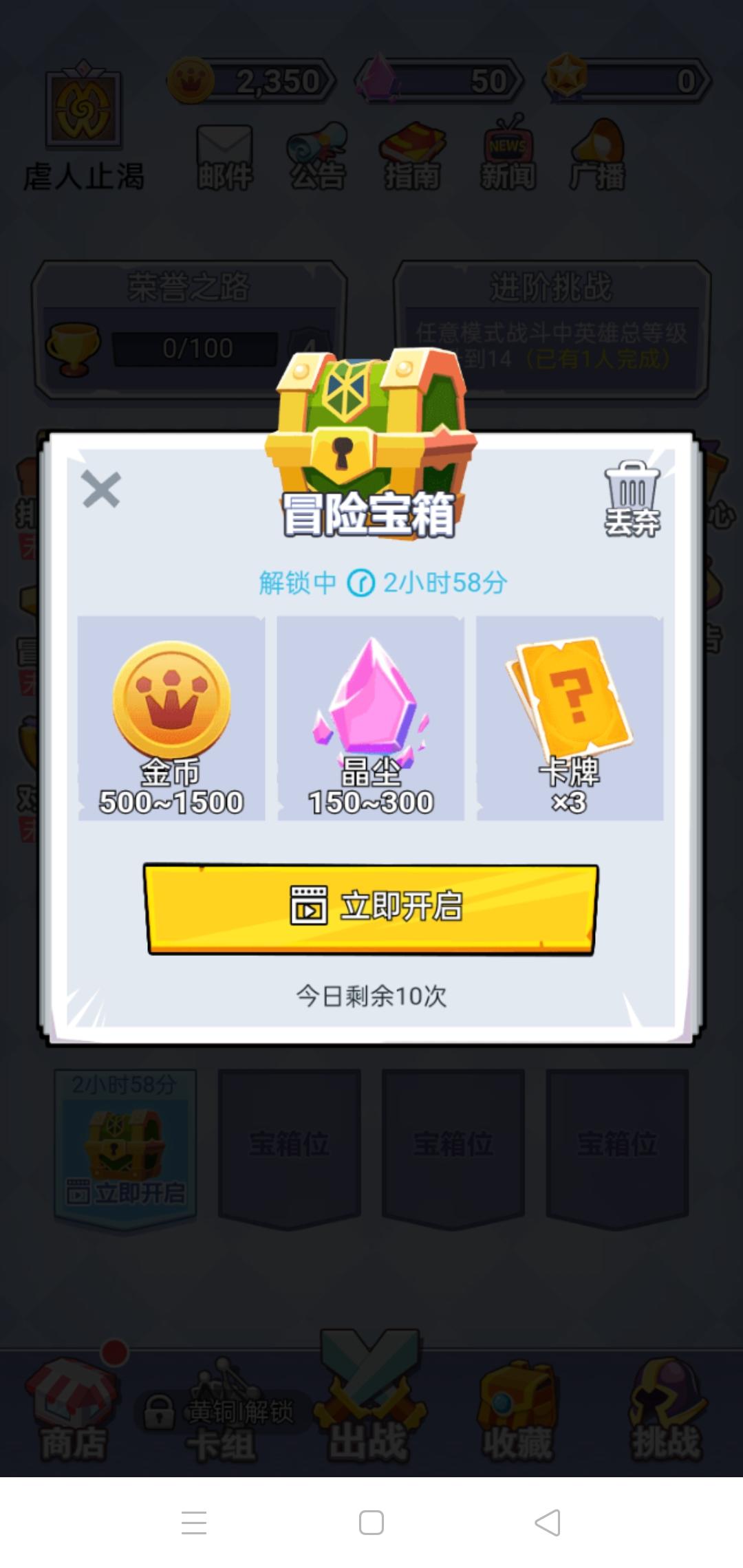 要注意的是冒险模式每个英雄可以携带超过6张卡! 所以可以主养2-3个英雄上5其他的多拿能量卡或者有高质量经验卡也拿着 另外就是我很多卡都没要 不论是打关卡还是箱子之类的卡我都选取弃 因为卡牌质量不高 只选择高质量得卡和买卡 前期不用担心牌少 因为牌少意味着你可以更快进入下一套牌 其实是一样的 ,只要质不要量,最后很荣幸参与本次内测。