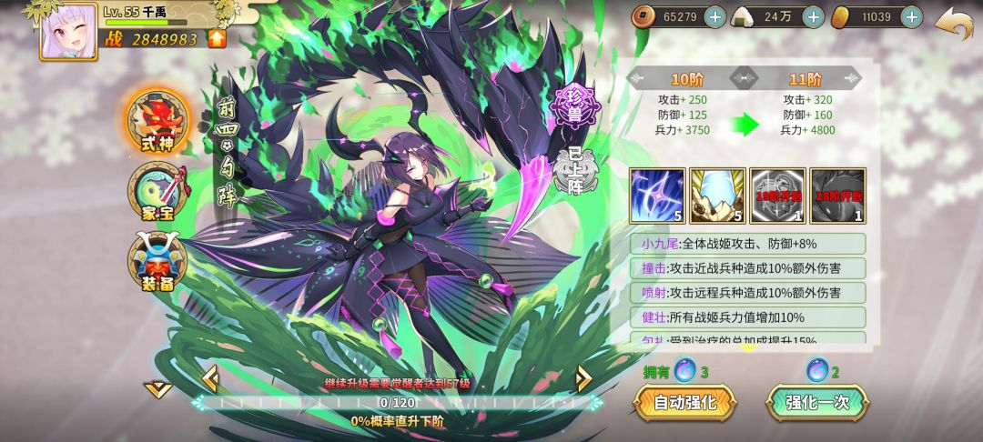 神器上面的小人,选兵力一次几万,殿里面的式神一级大几万,家宝也是,装备一点点来,战力也可以,一定要养奶 奶妈是很重要的,式神的技能也是可以升级的,没事上面的的东西点点,有的奖励或者战力没有红点