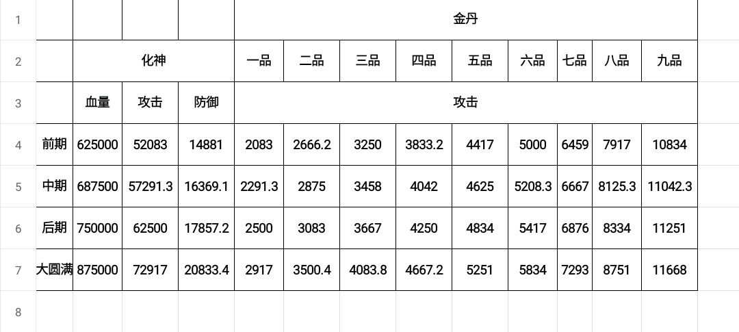 化神前期的攻击数据应该是52083,中期57291.3,后期62499.6四舍五入62500实际数据,大圆满72916.6四舍五入72917实际数据。