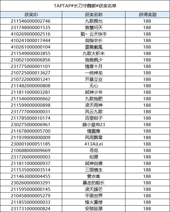 2.活动结束后的14个工作日内公布获奖名单,公布获奖名单后的7个工作日会根据各位主公参与活动时留下的游戏ID进行奖励的发放 ;
