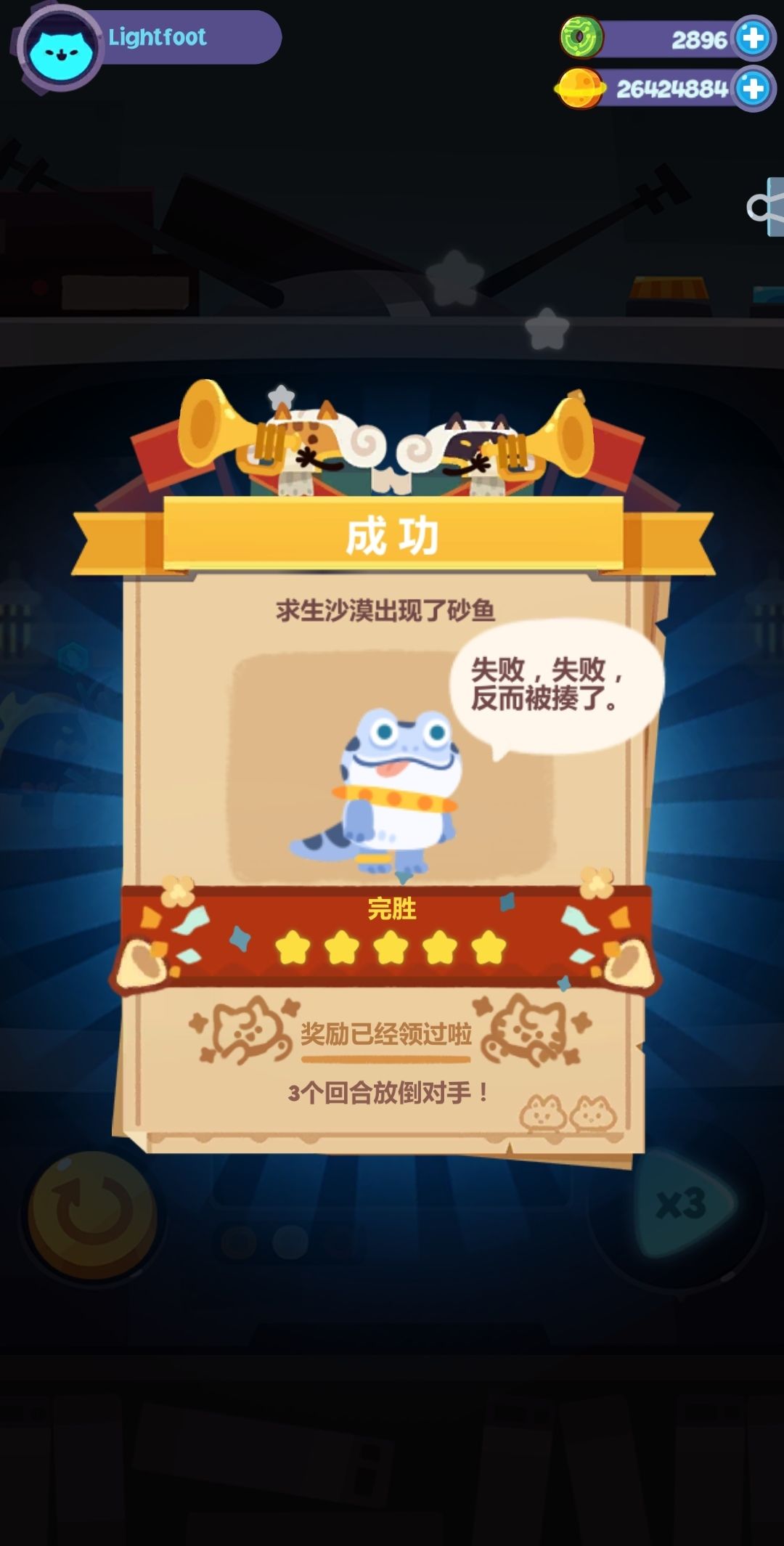 如果运气不好被连续暴击或者总吃回避就多试几次,运气好一次满星过,多试几次也不会超过三四次,还是挺轻松的