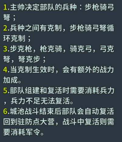 在国战中,存在部队兵种克制:步克枪,枪克骑,骑克弓,弓克弩,弩克步。克制生效情况下,会有额外战力加成。